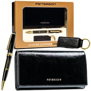 PETERSON Portfel damski ze skóry naturalnej klasyczny czarny zestaw portfel + długopis + brelok elegancki prezent antykradzieżowy RFID