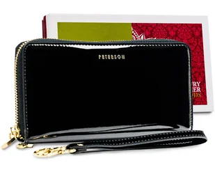 Duży, poziomy portfel damski typu piórnik, zamykany suwakiem. Na froncie logo marki Peterson. Wykonany z lakierowanej skóry naturalnej. Wewnątrz duża sekcja na dokumenty. Portfel chroniony antyskimmingową membraną. Zapakowany w markowe pudełko.