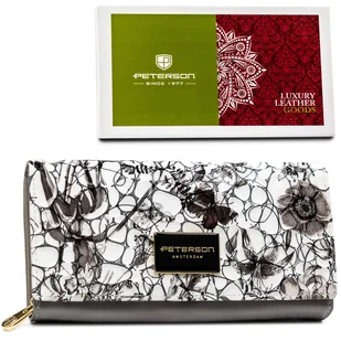 Peterson portfel damski skóra naturalna lakierowany poziomy duży pojemny Portfel Peterson® skórzany lakierowany Ten portfel to doskonałe połączenie stylu, elegancji i funkcjonalności. Wykonany z lakierowanej skóry naturalnej, zachwyca unikalnym designem oraz precyzyjnym wykonaniem. Model o poziomej orientacji z zatrzaskowym zapięciem sprawdzi się zarówno na co dzień, jak i na specjalne okazje. Zalety: ❇️ Marka Peterson® – Renomowana marka z wieloletnim doświadczeniem w tworzeniu wysokiej jakości galanterii skórzanej. ❇️ Skóra naturalna lakierowana – Elegancki, wytrzymały materiał gwarantujący długowieczność i ponadczasowy wygląd.