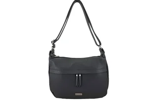pojemna torebka na ramię z kieszenią jest wykończona podszewką. Wnętrze podzielone jest na pół dużą zasuwaną kieszenią doszytą do spodu, dodatkowo wyodrębniono miejsce na telefon oraz małą zasuwaną kieszonkę mieszczącą kosmetyki lub portfel. Na zewnątrz znajdują się dwie zasuwane kieszenie - praktyczna, z tyłu umożliwiająca szybki dostęp np. do kluczy oraz duża z przodu ozdobiona skórzanymi paseczkami oraz wypustką na całej szerokości kryjącą suwak. Pojemna torebka na ramię z kieszenią jest zasuwana, posiada srebrne okucia oraz wygodnej długości uchwyt z regulacją (maksymalna dł. 110cm, maksymalna wys. 57cm, szerokość uchwytu 2,3cm).