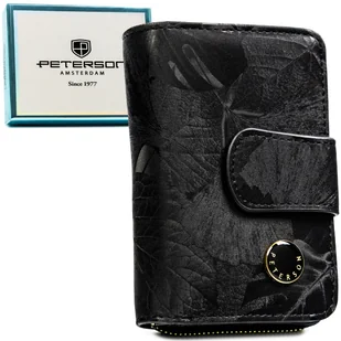 Portfel damski czarny PETERSON rfid stop mały pionowy na zatrzask i suwak modny motyw roślinny skóra naturalna i ekologiczna pudełko prezentowe