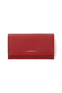 Duży, prostokątny portfel damski na zatrzask w pełnym stylu i charakteru czerwonym kolorze, sygnowany z przodu metalowym logotypem LANCERTO w kolorze złotym....