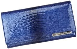 Portfel Damski Skórzany GREGORIO Skóra Licowa Lakierowana Duży Z Suwakiem Zapinka Wewnątrz GF-102 NIEBIESKI 19 x 9,5 x 3,5 [cm] Bardzo ładny damski portfel skórzany wysokiej jakości. Model ten jest niezwykle praktyczny, przeznaczony dla wymagających klientów ceniących sobie jakość i wytrzymałość. Do wykonania portfela wykorzystana została skóra licowa wysokiej jakości o intrygującej teksturze, miła i ciepła w dotyku. Również podszewki są uszyte z bardzo dobrej tkaniny o nowoczesnym wzornictwie i ładnej teksturze. Cechy charakterystyczne produktu: