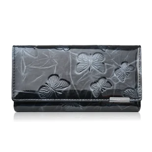 Jennifer Jones Materiał zewnętrzny: Skóra naturalna lakierowana z tłoczeniem „motyle” Materiał wewnętrzny: Skóra naturalna licowa Kolor: Czarny Kolor okuć: Srebrny Orientacja: