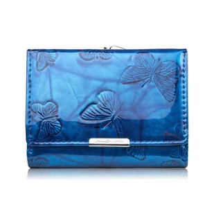 Jennifer Jones Materiał zewnętrzny: Skóra naturalna lakierowana z tłoczeniem „motyle” Materiał wewnętrzny: Skóra naturalna licowa Kolor: Niebieski Kolor okuć: Srebrny Orientacja: