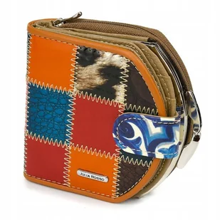 - Powierzchnię portfela ozdabia patchworkowy wzór wykonany z "kafelków" ze skóry o urozmaiconej strukturze i w różnych kolorach