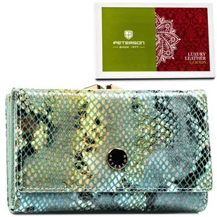 Portfel damski skórzany średni PETERSON portmonetka na zatrzask i bigiel rozbudowany na karty elegancki na prezent antykradzieżowy ochrona RFID Damski skórzany portfel Peterson®: #️⃣ Produkt polskiej marki, której zaufały tysiące Klientek! #️⃣ Jakość i precyzja wykonania | Odszyty z wysokogatunkowej skóry, bardzo przyjemnej w dotyku, #️⃣ Niespotykany design | Jego głównym elementem jest tekstura przypominająca skórę węża, skomponowana za pomocą błyszczącej siatki w niebieskim odcieniu z tłem o szarych i żółtych akcentach. Portfel ma elegancki, połyskujący wygląd, co nadaje mu luksusowego charakteru. Na przedniej części widoczny jest emblemat, który dodatkowo podkreśla markowy charakter produktu. #️⃣ Duża ilość praktycznych przegródek i schowków | Ten model zaprojektowano niezwykle intuicyjnie i funkcjonalnie.