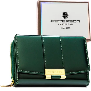 Portfel damski zielony PETERSON mały lakierowany elegancki rozbudowany na karty zatrzask i suwak RFID