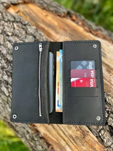 Portfel męski skórzany duży na karty na banknoty z miejscem na telefon z suwakiem na bilon czarny z grawerem handmade