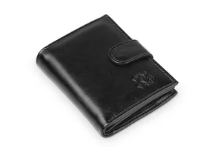 gładka, naturalna skóra licowa uszyty z dbałością o najmniejszy detal wytłoczone logo na froncie portfela zamykany paskiem z zatrzaskiem okucia w srebrnym kolorze ochrona kart RFID PROTECTION kieszeń na banknoty piętnaście kiszonek na karty lub dokumenty, w tym cztery z okienkiem dodatkowa, wewnętrzna kieszonka zamykana na suwak miła w dotyku, wewnętrzna podszewka kieszeń na bilon, zamykana na zatrzask