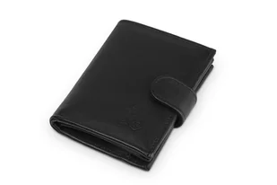 gładka, naturalna skóra licowa uszyty z dbałością o najmniejszy detal wytłoczone logo na froncie portfela zamykany paskiem z zatrzaskiem okucia w srebrnym kolorze ochrona kart RFID PROTECTION kieszeń na banknoty trzynaście kiszonek na karty lub dokumenty, w tym trzy z okienkiem pasek z zatrzaskiem zabezpieczający wewnętrzne kieszenie dodatkowa, wewnętrzna kieszonka zamykana na suwak miła w dotyku, wewnętrzna podszewka kieszeń na bilon, zamykana na zatrzask