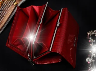 Wysokiej jakości, damski portfel wykonany z miękkiej, lakierowanej skóry naturalnej, marki Alessandro Paoli. Model 70-04 w kolorze czerwonym z wzorem w krese...