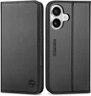 Shieldon naturalne skórzane etui z klapką do iPhone 16 portfel Rfid czarne
