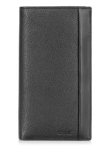 Portfel męski w kolorze czarnym. Wykonany ze skóry naturalnej o groszkowanej strukturze. Model może służyć jako pokrowiec lub wizytownik na dokumenty bądź karty. kolor czarny skóra naturalna groszkowana model jednokomorowy brak zapięcia wewnątrz kieszeń na suwak (na bilon), 5 kieszeni otwartych, kieszeń na banknoty, 8 miejsc na karty płatnicze, kieszeń siateczkowa oraz 2 kieszenie dodoatkowe model mieści dowód rejestracyjny Wymiary wysokość – 21 cm szerokość – 12 cm głębokość – 2,5 cm