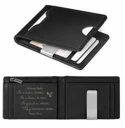 W skórzanym portfelu znajdować się będą tylko najpotrzebniejsze karty magnetyczne, banknoty, monety, a nawet zdjęcia najbliższych członków rodziny. Dobrze przemyślano jego funkcjonalność! W 9 praktycznych przegródkach schowaj kartę płatniczą, dowód osobisty, prawo jazdy i używane karty lojalnościowe. Jedna z przegródek umiejscowiona jest po zewnętrznej stronie, by ułatwić dostęp do często używanej karty. Może to tam będzie Twoja karta płatnicza? Wypełnij skórzany portfel, a on pozostanie nadal w rozmiarze SLIM! Wybierz projekt osobistej dedykacji i stwórz wspaniały, grawerowany prezent na zbliżającą się okazję . wymiary portfela - 11 cm x 8,5 cm x 1,5 cm wymiary opakowania - 19 cm x 14 cm x 2 cm materiał - naturalna skóra bydlęca wzór - gładki kolor - czarny na zewnątrz - 1 kieszeń na kartę (8,5 cm x 5,5 cm), w środku - 1 zamykana kieszeń na monety , 8 kieszeni na karty (8,5 cm x 5,5 cm) oraz klips na banknoty kolor - czarny personalizowany grawer z dedykacją dla bliskiej osoby produkt idealny na prezent - pakowany w specjalną torebkę upominkową z logo Maverton PORT-BK-031