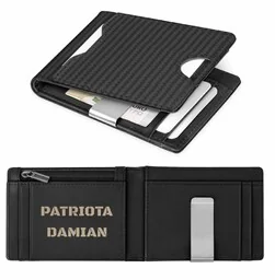 W skórzanym portfelu znajdować się będą tylko najpotrzebniejsze karty magnetyczne, banknoty, monety, a nawet zdjęcia najbliższych członków rodziny. Dobrze przemyślano jego funkcjonalność! W 9 praktycznych przegródkach schowaj kartę płatniczą, dowód osobisty, prawo jazdy i używane karty lojalnościowe. Jedna z przegródek umiejscowiona jest po zewnętrznej stronie, by ułatwić dostęp do często używanej karty. Może to tam będzie Twoja karta płatnicza? Wypełnij skórzany portfel, a on pozostanie nadal w rozmiarze SLIM! Wybierz projekt osobistej dedykacji i stwórz wspaniały, grawerowany prezent na zbliżającą się okazję . wymiary portfela - 11 cm x 8,5 cm x 1,5 cm wymiary opakowania - 19 cm x 14 cm x 2 cm materiał - naturalna skóra bydlęca wzór - karbon (na zewnątrz), gładki (wewnątrz) kolor - czarny na zewnątrz - 1 kieszeń na kartę (8,5 cm x 5,5 cm), w środku - 1 zamykana kieszeń na monety , 8 kieszeni na karty (8,5 cm x 5,5 cm) oraz klips na banknoty kolor - czarny personalizowany grawer z dedykacją dla bliskiej osoby produkt idealny na prezent - pakowany w specjalną torebkę upominkową z logo Maverton PORT-CAR-023