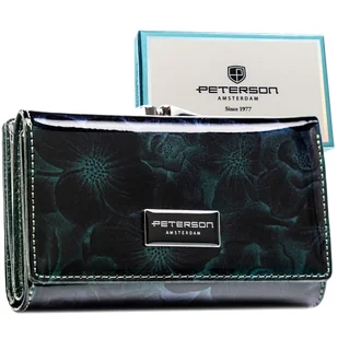 Portfel Peterson damski błyszczący lakierowany na bigiel ochrona kart RFID Portfel damski Peterson®️ w kwiaty Ten model portfela Peterson®️ zachwyca detalem, proporcją i jakością wykonania, oferując nie tylko modny akcent, ale także doskonale przemyślane wnętrze. To propozycja dla kobiet, które kochają piękne dodatki, ale nie idą na kompromis w kwestii funkcjonalności. Zalety: