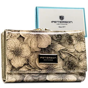 Złota portmonetka damska na zatrzask i bigiel portfel w kwiaty skóra naturalna i ekologiczna PETERSON rozbudowany na karty i dokumenty lakierowany e..