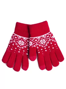 Rękawiczki pięciopalczaste – wygodne Do ekranów dotykowych Ocieplane – ochrona przez chłodem Elastyczne – dobrze dopasowują się do dłoni Modne – norweski wzór Mankiet z gumką – komfortowe użytkowanie Praktyczne, dziewczęce rękawiczki z przyjemnego materiału. W kolorze czerwonym, z motywem norweskim. Grube, w środku posiadają ocieplenie, gwarantujące duży komfort cieplny. Świetnie prezentują się na dłoniach. Na końcówkach obu palców wskazujących i kciukach został naszyty materiał umożliwiający posługiwanie się ekranami dotykowymi.