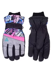 Rękawiczki pięciopalczaste – wygodne Grube i ciepłe – ochrona przed chłodem i wilgocią Ułatwiające chwytanie – warstwa antypoślizgowa Odblaskowe elementy Elastyczny ściągacz i regulacja na rzep – dla lepszego dopasowania Narciarskie rękawiczki damskie w kolorze czarno-szarym z różowo-niebieskim wzorem na zewnętrzej części rękawiczki. Wnętrze rękawiczki wykończone miłym polarem. Na nadgarstku zapinane na rzep. Na górze zakończone dzianinowym ściągaczem, który zabezpiecza przed dostaniem się śniegu pod rękawiczkę. Na kciuku i wewnętrznej stronie dłoni posiadają dodatkową warstwę antypoślizgową ułatwiającą chwytanie.