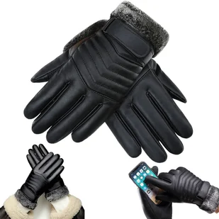 Rękawiczki Zimowe Męskie Dotykowe Ocieplane Antypoślizgowe Ekoskóra Czarne