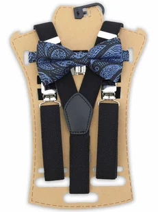 Czarny zestaw - gładkie szelki i mucha w niebieski paisley XM14 Szerokość taśmy szelek: 2,5 cm Długość szelek: 75-110 cm Regulacja muszki w obwodzie do 46 cm...