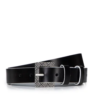 Damski pasek skórzany. Ten nowoczesny pasek wprowadzi nowy styl do Twojej szafy. Prosty fason zdobią kontrastowo wykończone brzegi. Całość dopełnia prostokątna klamra ozdobiona geometrycznym wzorem. Ten model wykonany ze skóry naturalnej świetnie urozmaici zarówno ulubione dżinsy, jak i minisukienkę.