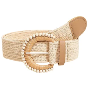 Pasek słomiany beżowy elastyczny pas na talię pleciony z koralikami