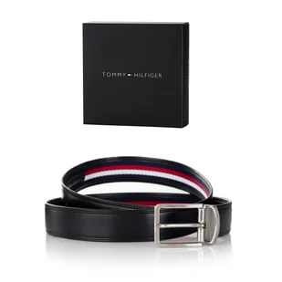 Stylowy i praktyczny pasek męski TOMMY HILFIGER to doskonały dodatek dla mężczyzn ceniących markowy design, funkcjonalność oraz ponadczasową elegancję. Model dwustronny oferuje dwie różne odsłony: klasyczną czarną oraz ozdobioną charakterystycznymi flagowymi paskami Tommy Hilfiger w kolorach granatowym, czerwonym i czarnym, co pozwala łatwo dopasować pasek do formalnych i casualowych stylizacji. Pasek został wykonany z wysokiej jakości skóry ekologicznej, która zapewnia estetyczny wygląd, trwałość i komfort użytkowania. Metalowa klamra z logo Tommy Hilfiger podkreśla prestiżowy charakter produktu i dbałość o detale.