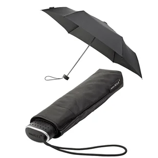 Damska, krótka płaska parasolka firmy Impliwa w kolorze czarnym. Wygodna, składana na trzy, bardzo lekka i malutka - idealna do torebki czy też plecaka. Konstrukcja oparta na chromowanym stelażu zapewnia wytrzymałość podczas deszczu. Dobrze wyprofilowana płaska plastikowa rączka zapewnia komfort trzymania, a dodatkowy uchwyt z gumki ułatwia przenoszenie. Parasolka w pokrowcu w kolorze czaszy.