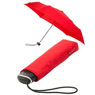 Damska, krótka płaska parasolka firmy Impliwa w kolorze czerwonym. Wygodna, składana na trzy, bardzo lekka i malutka - idealna do torebki czy też plecaka. Ko...