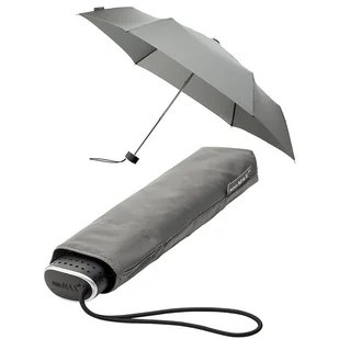 Damska, krótka płaska parasolka firmy Impliwa w kolorze szarym. Wygodna, składana na trzy, bardzo lekka i malutka - idealna do torebki czy też plecaka. Konstrukcja oparta na chromowanym stelażu zapewnia wytrzymałość podczas deszczu. Dobrze wyprofilowana płaska plastikowa rączka zapewnia komfort trzymania, a dodatkowy uchwyt z gumki ułatwia przenoszenie. Parasolka w pokrowcu w kolorze czaszy.