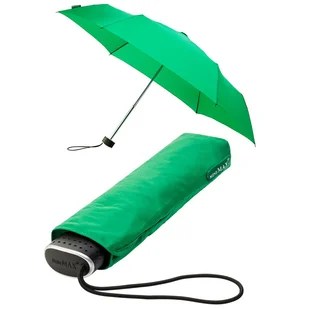 Damska, krótka płaska parasolka firmy Impliwa w kolorze zielonym. Wygodna, składana na trzy, bardzo lekka i malutka - idealna do torebki czy też plecaka. Konstrukcja oparta na chromowanym stelażu zapewnia wytrzymałość podczas deszczu. Dobrze wyprofilowana płaska plastikowa rączka zapewnia komfort trzymania, a dodatkowy uchwyt z gumki ułatwia przenoszenie. Parasolka w pokrowcu w kolorze czaszy.