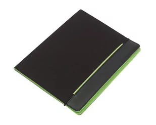 Portfolio YOUNG STAR w formacie A4 Z notesem, wsuwanymi kieszonkami, pętelkami na długopis i inne akcesoria, zamykane gumką. Na zewnątrz czarne, w środku kol...
