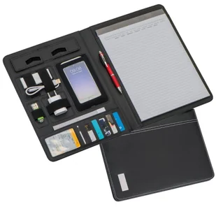 Folder A4 z wysokiej jakości skóry mielonej. Posiada liczne przegródki, kieszeń i podstawkę pod telefon, miejsce na długopis oraz notes w linie z małym kalen...