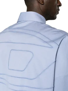 marka: Diesel opis: koszula męska o luźnym kroju, uszyta z bawełnianej popeliny, ozdobiona wyhaftowanym logo firmy na plecach kolor: jasnoniebieski rozmiar: 50 wymiary: szerokość w klatce piersiowej 66 cm, długość bez kołnierza 83 cm, rękaw od obniżonego ramienia 54 cm, od pachy 51 cm skład: