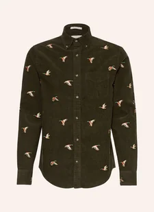 Kieszeń piersiowa. Nakładana listwa guzikowa. Mankiety z jednym guzikiem z regulacją obwodu. Motywy kaczek na całej powierzchni. Drobny sztruks.
