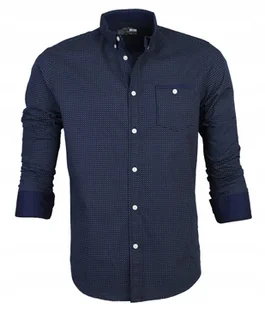 Starannie wykończona koszula męska na długi rękaw. Piękny geometryczny wzór w odcieniach granatu. Białe guziczki dodają sportowego charakteru. MODEL: KOSZ.DR...