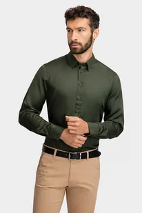 Zielona, gładka koszula męska o fasonie slim. Wykonana z wysokogatunkowej bawełny z dodatkiem elastanu, co zapewnia wyjątkowy komfort noszenia i idealne dopasowanie. Model z uniwersalnym kołnierzykiem typu button-down, doskonały na każdą porę roku.