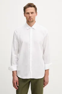 Biała koszula męska Trussardi to wszechstronny element garderoby, który łączy w sobie swobodny styl z nutą klasycznej elegancji. Wykonana w 100% z naturalnego lnu, sprzyja komfortowi noszenia i przewiewności, co czyni ją odpowiednią bazą dla wielu stylizacji. Ten model, charakteryzujący się krojem regular fit i szalowym kołnierzem, jest propozycją dla mężczyzn ceniących minimalistyczny design z miejskim akcentem.