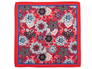 Czerwona poszetka w kolorowe kwiaty - E331 Czerwona poszetka w kolorowe kwiaty - E331 Wymiary poszetki: 30cm x 30cm. Wzór: Inny|Kwiaty Dominujący kolor: Wiel...