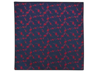 Granatowa poszetka w czerwone flamingi E323 Granatowa poszetka w czerwone flamingi E323 Wymiary poszetki: 25cm x 25cm. Wzór: Zwierzęta Dominujący kolor: Gran...