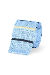 Krawat dzianinowy typu knit w błękitnym kolorze w kolorowe paski. Dzięki uniwersalnej szerokości (6 cm) krawat pasuje do kołnierzyków klasycznych kent, włosk...