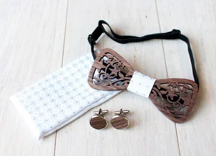 Przedstawiamy Państwu nietypowy i ciekawy zestaw. W skład zestawu wchodzą: 1) Drewniana muszka wykonana z drewna orzechu amerykańskiego, grawerowana na wylot. Tkanina w obszyciu w ciekawym, starannie wyk ...