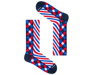 Kolorowe skarpetki Traugutta 10m6 wykonane zostały z zastosowaniem dwóch wzorów: ukośnych pasów z przodu oraz kratki z tyłu. Wykorzystane kolory (niebieski, biały i czerwony) sprawiają, że patrząc na tą skarpe ...