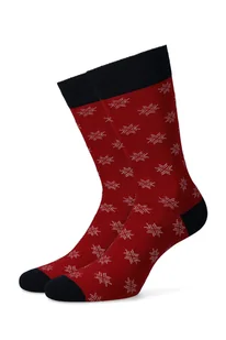 Czerwone męskie skarpety w śnieżynki. Kolorowe skarpetki świąteczne wykonaliśmy z wytrzymałej i przyjemnej w dotyku dzianiny z przewagą bawełny i nieznaczną ...