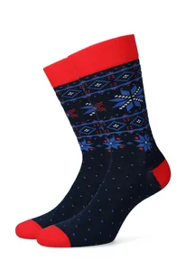 Męskie skarpety ciemnogranatowe w kropki oraz świąteczny wzór. Skarpetki świąteczne wykonaliśmy z wytrzymałej i przyjemnej w dotyku dzianiny z przewagą baweł...