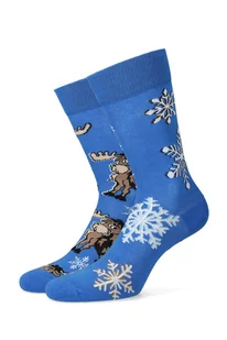 Skarpety męskie świąteczne, niebieskie. Prawa i lewa skarpeta posiadają inne wzory, które do siebie pasują kolorem. Zdobią je świąteczne motywy w renifery i śnieżynki. Kolorowe skarpetki świąteczne wykonaliśmy z wytrzymałej i przyjemnej w dotyku dzianiny z przewagą bawełny i nieznaczną domieszką poliamidu, polipropylenu, elastodienu i elastanu, dzięki czemu skarpety są wytrzymałe i zachowują pożądany kształt po długim użytkowaniu oraz wielokrotnym praniu. Wygodny ściągacz i płaski szew dają doskonały komfort użytkowania.