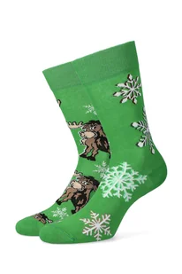 Skarpety męskie świąteczne, zielone. Prawa i lewa skarpeta posiadają inne wzory, które do siebie pasują kolorem. Zdobią je świąteczne motywy w renifery i śnieżynki. Kolorowe skarpetki świąteczne wykonaliśmy z wytrzymałej i przyjemnej w dotyku dzianiny z przewagą bawełny i nieznaczną domieszką poliamidu, polipropylenu, elastodienu i elastanu, dzięki czemu skarpety są wytrzymałe i zachowują pożądany kształt po długim użytkowaniu oraz wielokrotnym praniu. Wygodny ściągacz i płaski szew dają doskonały komfort użytkowania.