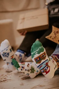 Magia jarmarku świątecznego na Twoich stopach Skarpetki Jarmark Świąteczny przenoszą prosto do bajkowego, zimowego miasteczka pełnego świątecznego nastroju. Na białym tle rozgrywa się radosna, kolorowa sceneria świątecznego jarmarku: oświetlone domki, duża karuzela, udekorowane choinki oraz postaci bawiące się na śniegu. Żywe barwy – zielenie, czerwienie, błękity i granaty – tworzą ilustracyjny, pełen energii obraz, który od razu wprowadza w świąteczny klimat. To idealne skarpetki na grudniowe wieczory, spotkania świąteczne, mikołajki i wszystkie dni, w które potrzebujesz odrobiny zimowej magii.